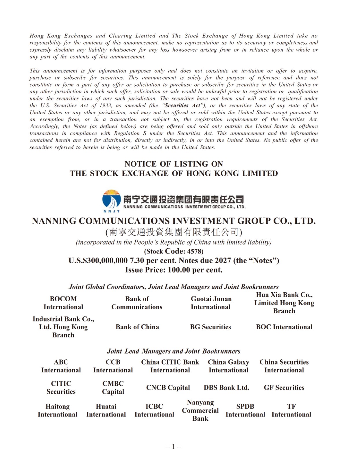 Nanning Communications Investment Group Co., Ltd.(南寧交通投資集團有限責任公司) - U.S.$300,000,000 7.30 per cent. Notes due 2027