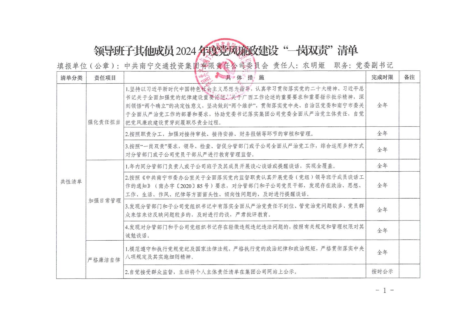 領導班子其他成員2024年度黨風廉政建設“一崗雙責”清單(一)