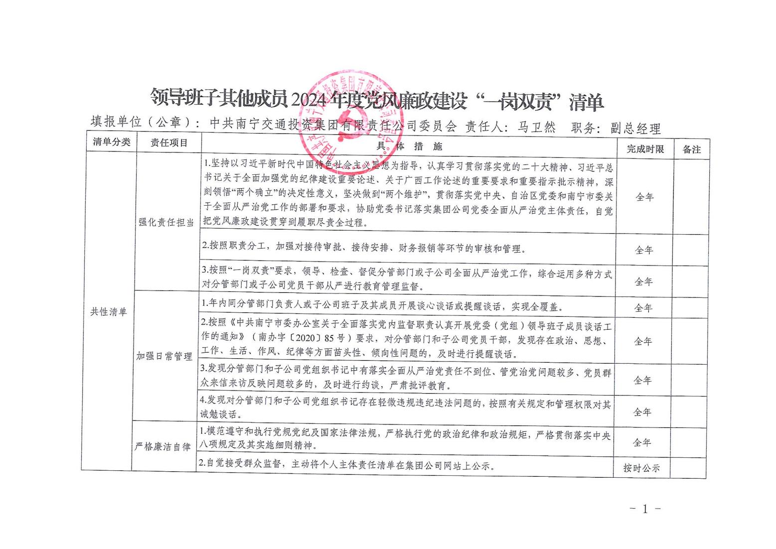 領導班子其他成員2024年度黨風廉政建設“一崗雙責”清單(五)