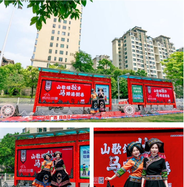 三月三,穿傳統(tǒng)服飾過節(jié)必不可少。瞧,公交候車亭也穿上了節(jié)日的盛裝,鮮艷的色彩、精美的圖案,濃濃的民族風(fēng)情,為城市增添了一道亮麗的風(fēng)景,營(yíng)造了濃厚的節(jié)日氛圍。圖為賽揚(yáng)傳媒公司員工身著傳統(tǒng)服飾在公交候車亭旁合影。