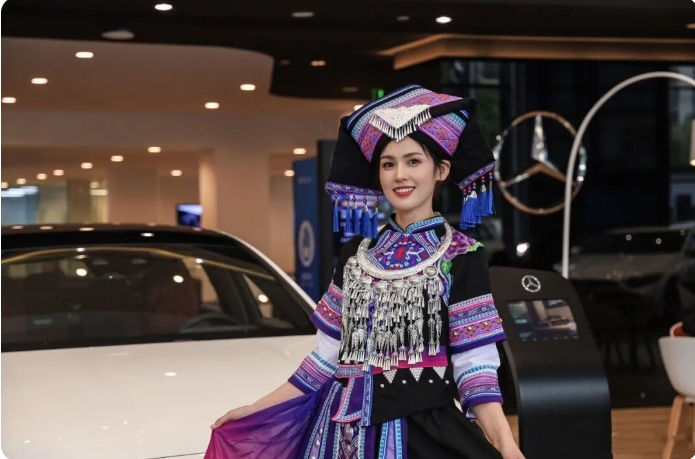 壯族的傳統(tǒng)服飾衣裙顏色為藍(lán)黑色,色澤鮮艷且不易褪色,既耐臟又耐穿,充分體現(xiàn)了壯族人民的智慧和文化,也寄托了壯族人民對(duì)美好生活的向往和追求。圖為康城汽車集團(tuán)冠星公司員工展示壯族服飾。