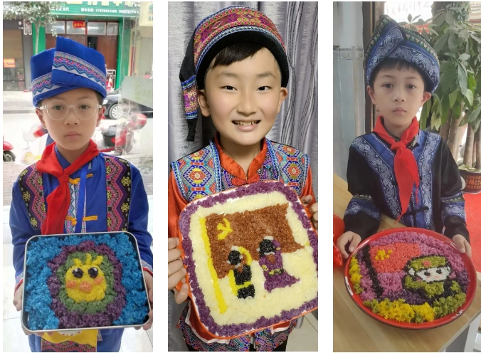 “長(zhǎng)桌宴”又稱合攏宴,是侗族、苗族、瑤族等多個(gè)民族的風(fēng)俗習(xí)慣,常用于接親嫁女、滿月酒、村寨聯(lián)誼等宴飲活動(dòng),代表最為隆重的待客禮俗,已有幾千年歷史。“長(zhǎng)桌宴”上有壯族特色的五色糯米飯、艾葉糍粑、壯粽,苗族的傳統(tǒng)佳肴,還有黎族的三色飯……一份份美食造型美觀、色彩鮮艷、香味撲鼻。圖為集團(tuán)職工拍攝的孩子參加學(xué)?!叭氯被顒?dòng)。